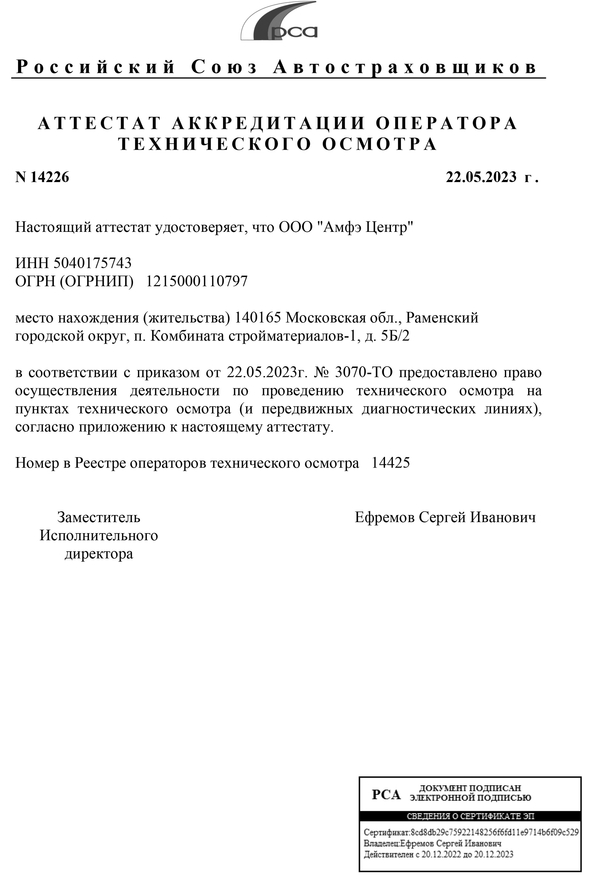 Общество с ограниченной ответственностью "АМФЭ ЦЕНТР" внесён в реестр операторов технического осмотра за №14425. По номеру оператора, указанному в аттестате, можно проверить аккредитацию на сайте РСА.